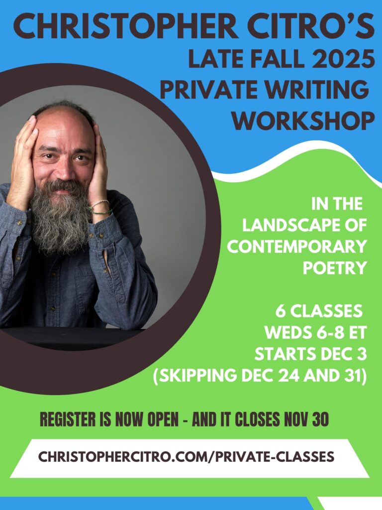 I just opened registration for my WINTER 2026 private Zoom-based poetry workshop. It will take place, as usual, Wednesday evenings 6-8 pm Eastern Time. It begins February 11 and runs for 6 classes.